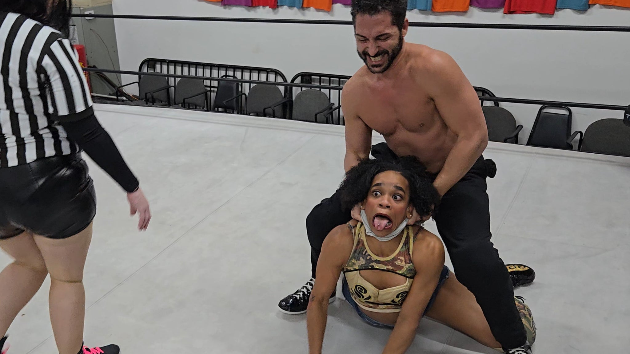 Chasyn answered with a skull-crushing DDT, but La Rosa refused to stay down. Sensing urgency, Chasyn removed his tank top and used it as a weapon, choking La Rosa into a Camel Clutch before transitioning into a bridging chin lock. La Rosa fought back, countering into a rear chin lock of her own. As Chasyn attempted to power out—sliding through and lifting her for an atomic drop—the reality set in.